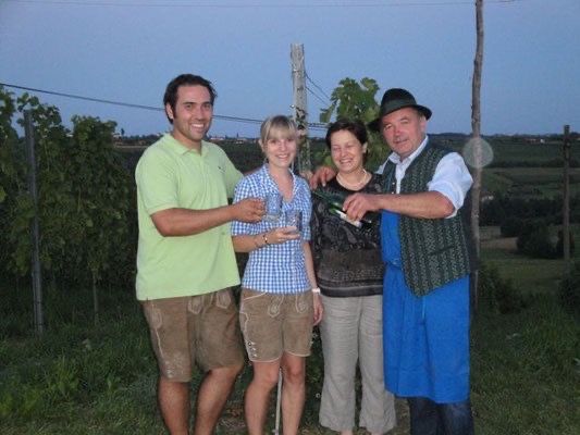 Während Marianne,Viktoria und Jenny sich liebevoll um die Buschenschankküche und das leibliche Wohl der Gäste kümmern, bemühen sich Viktor mit Christoph und Philipp um den Weingarten, die edlen Tropfen und die Selchspezialitäten.